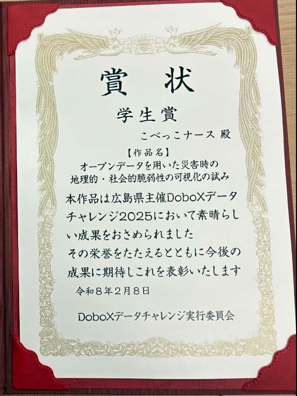 4年生の荒木美帆さんがが、インフラマネジメント基盤(DoboX)のデータを活用した全国コンテスト「DoboXデータチャレンジ」において、一次審査を通過し、ファイナルで学生賞を受賞しました。