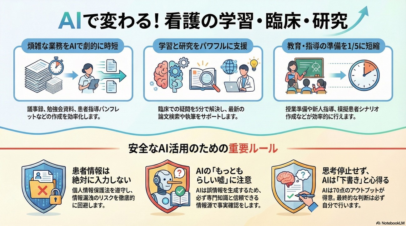 「AIは難しそう…」という初心者から、研究・教育に活用したい指導者まで役立つ内容で、議事録作成、教育資料作成、患者指導パンフレットの作成など、具体的なプロンプト(指示文)の例を交えて分かりやすく紹介されています。情報漏洩や誤情報(ハルシネーション)への対策も解説。日々の業務効率化と質の向上を両立させ、初学者から指導者まで、幅広いフェーズで役立つ内容となっております。