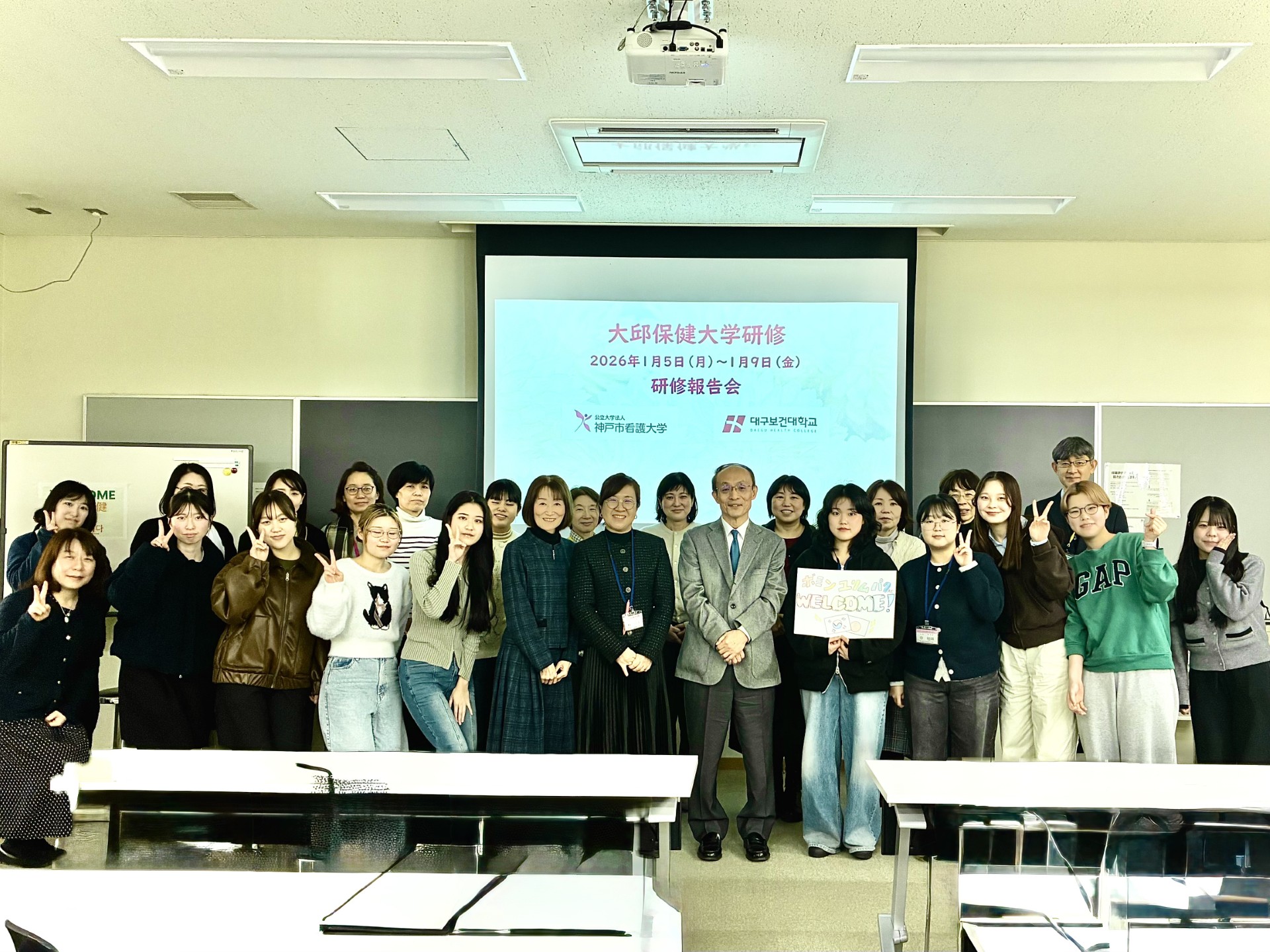 2026年1月5日(月)~1月9日(金)に大邱保健大学とのLOI協定に基づき、大邱保健大学看護学科3回生2名と教員1名の研修生を受け入れ、本学の学生と交流を図りました。