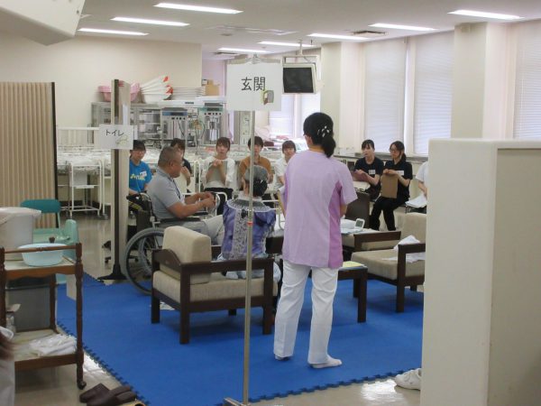 訪問看護の場面は、退院後1日目と2週間後の2場面で行いました。最初の場面では、退院後初めて自宅で血圧測定等を行います。来客者として迎えられる立場に戸惑いながら学生は、「場所が変わっても、観察しなければならないことや注意すべき点は同じ」であることに気づき、「訪問時のマナーをしっかり身に付けること」の大切さを学んでいました。2週間後の場面では、頑固な便秘に悩む療養者と不眠で疲労気味の介護者に対応するものです。訪問時に状況の変化に気づき、どのように対処していくか、そのプロセスを踏むなかで、「これまでの知識、看護技術を駆使すること」や「今までの学びを線で繋いで自分のものにする必要性」を学んでいました。また、介護疲れのある介護者には、「どのような内容の話をどのタイミングで聞いていくのか、話の流れを上手く見つけることが大切」など、療養者と介護者双方の思いを考えてのコミュニケーションの重要性を学んでいました。3年生後期から始まる看護学実習の事前準備として、既習内容を統合させていく実践的な演習を行うことができました。
